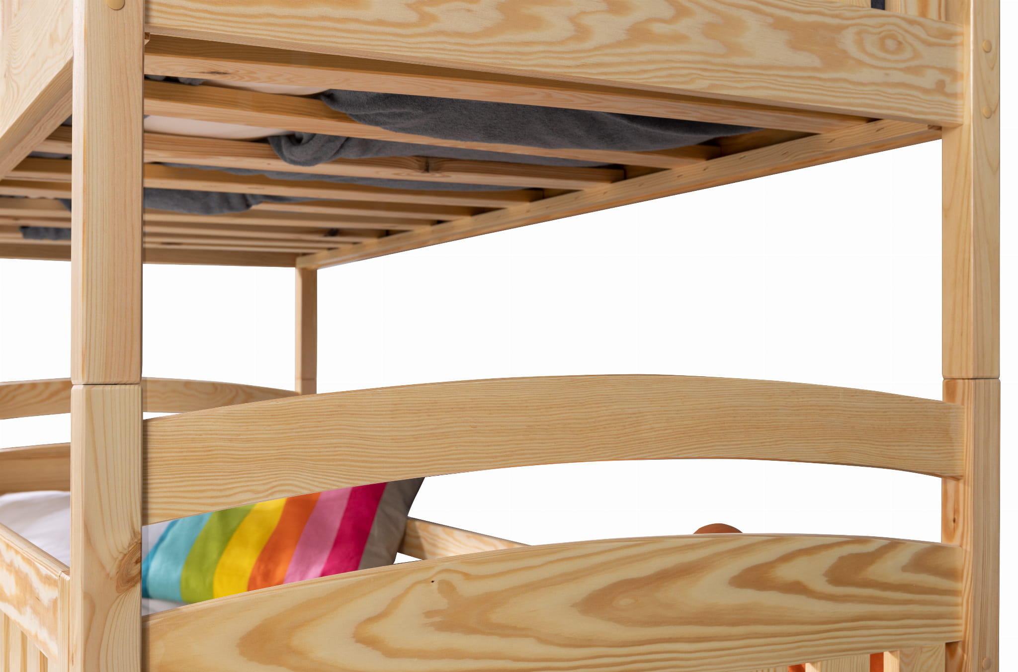 Łóżko piętrowe trzyosobowe Kasia wykonane jest w całości z litego drewna sosnowego, lakierowane trzykrotnie ekologicznymi farbami.